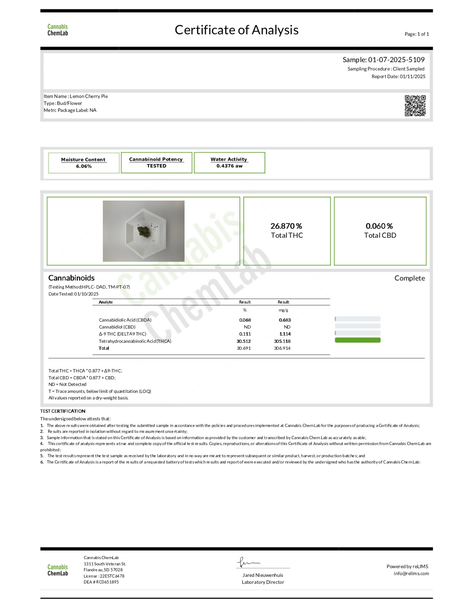 Lemon Cherry Pie is an evenly balanced hybrid strain (50% indica/50% sativa) created through crossing the iconic Lemon Cherry Gelato X Georgia Pie strains.